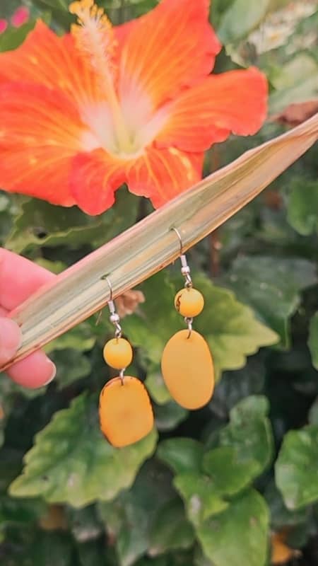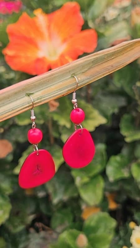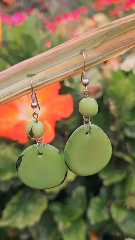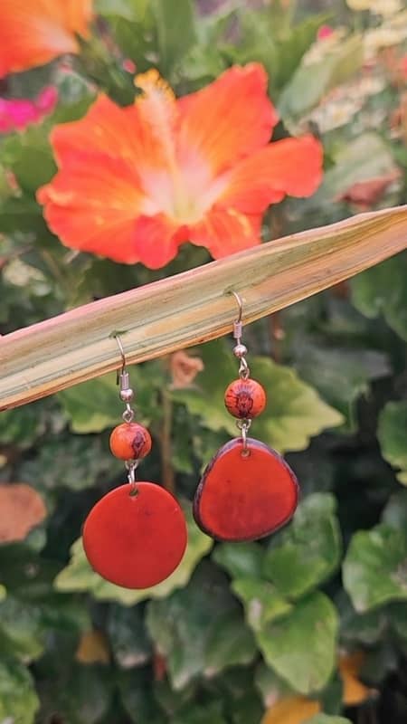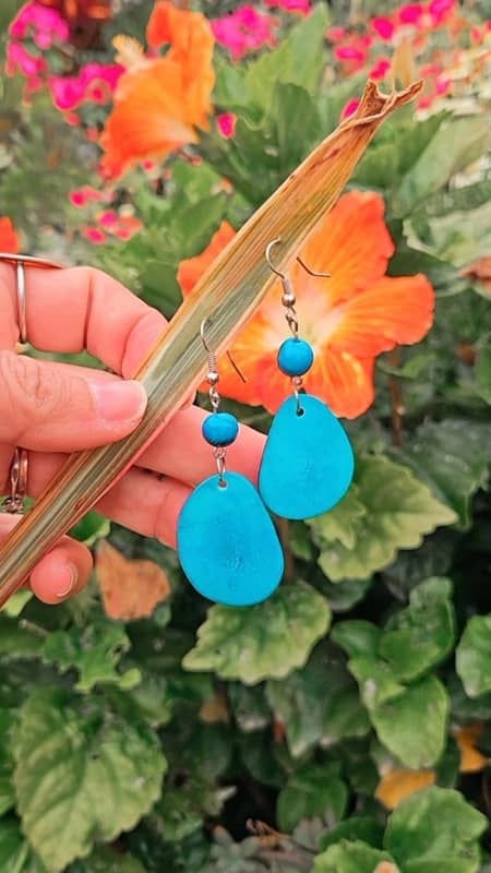 Nuestros pendientes están elaborados artesanalmente con semillas de tagua, una palma nativa de las selvas tropicales de Perú y el Amazonas. Conocida mundialmente como el marfil vegetal, la tagua es una semilla que, al secarse y pulirse, adquiere una textura y dureza idénticas al marfil animal, pero de origen 100% botánico y sostenible.
