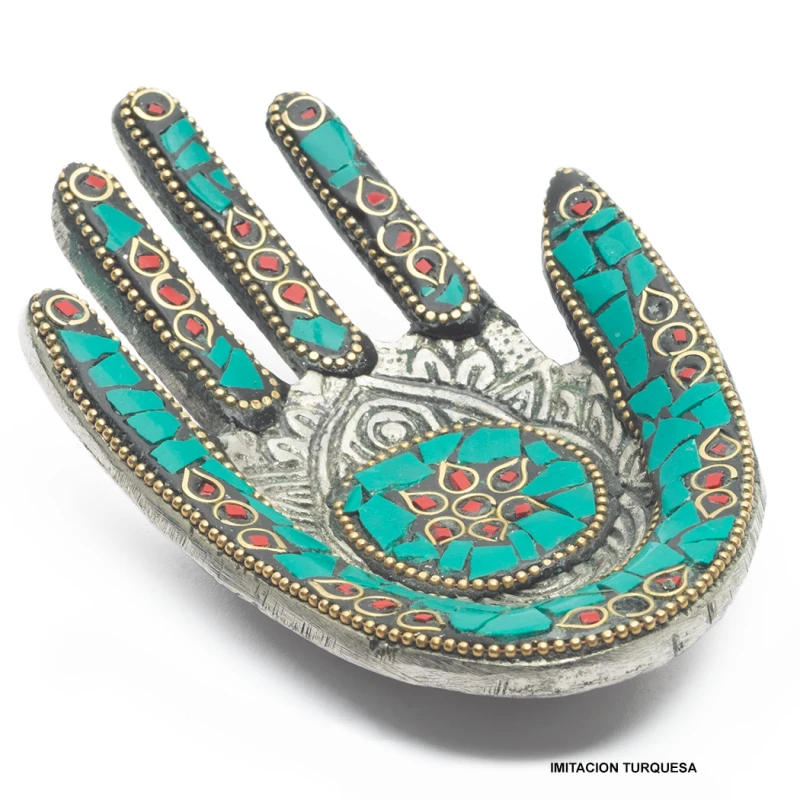 Este incensario metálico en forma de mano combina simbología espiritual y estética artesanal. Cada dedo y el contorno de la palma están cuidadosamente decorados con resinas de colores que simulan piedras semipreciosas como la turquesa o el coral, creando un efecto visual vibrante y lleno de energía.