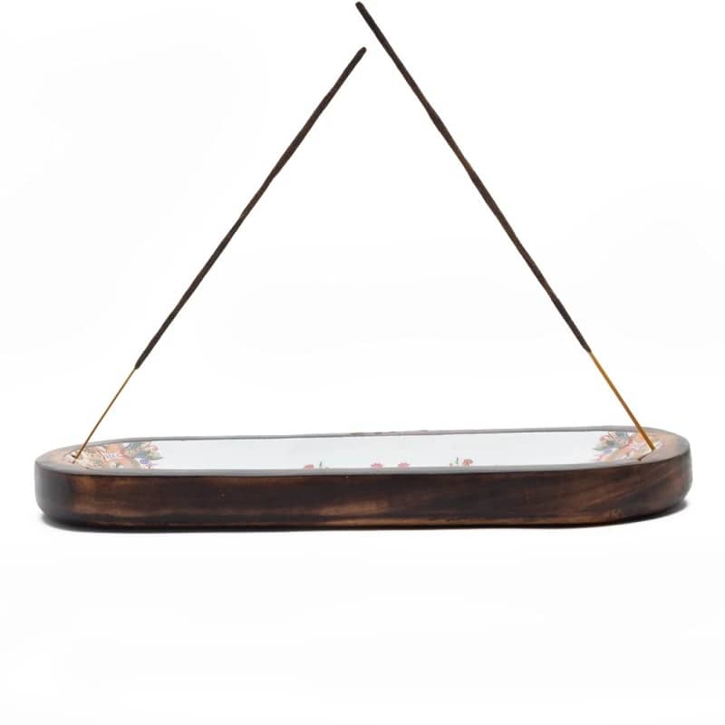 Este incensario de madera ha sido trabajado a mano y decorado con un esmaltado colorido de estilo hindú. Su forma alargada y tamaño generoso lo convierten en un incensario grande ideal para quemar varillas de incienso sin preocuparte por las cenizas, que quedarán perfectamente recogidas.