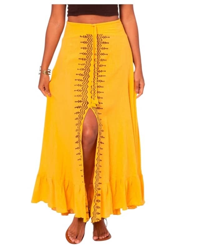 Falda Larga Bohemia de Algodón 100% – Amarilla con Apertura Central
