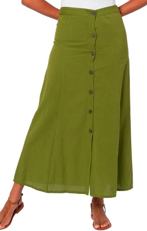 Presenta un corte de tiro alto que estiliza la cintura, fluyendo hacia una línea «A» que aporta movimiento al caminar. La botonadura frontal de coco le da un toque rústico pero refinado, permitiendo jugar con la abertura inferior según tu estilo. Es la prenda ideal para combinar con sandalias de cuero y accesorios étnicos, tal como se muestra en la imagen.