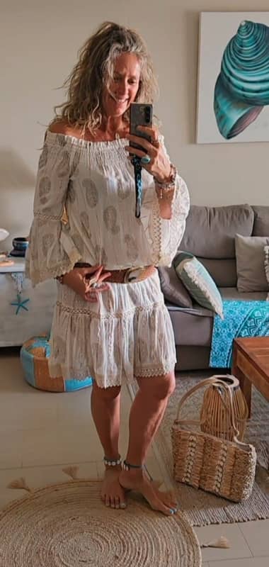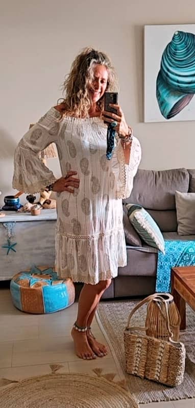 Este vestido captura la esencia de Ibiza en cada detalle. Su tejido de 100% viscosa ofrece una caída fluida y un movimiento espectacular, ideal para esos días de sol. El escote tipo barca realza la silueta de forma femenina, mientras que las mangas acampanadas con puntilla aportan ese toque artesanal y auténtico del estilo bohemio.